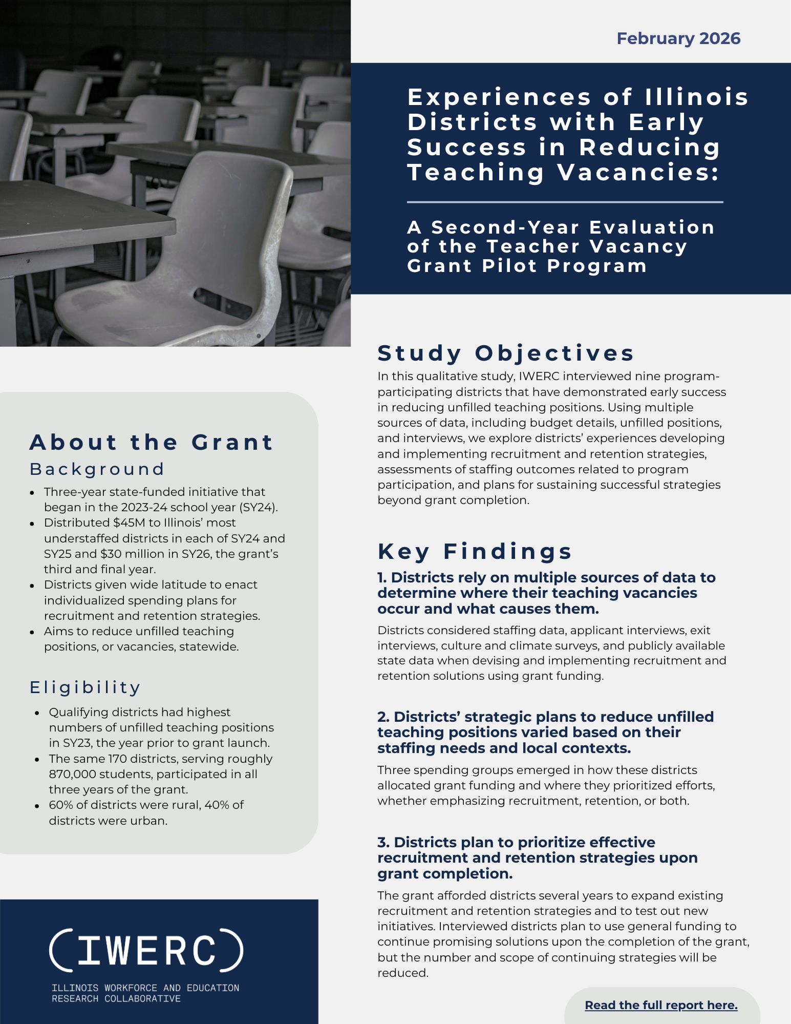 IWERC is conducting an evaluation of the state’s Teacher Vacancy Grant Pilot Program (TVGPP). The TVGPP is a three-year initiative, which began in the 2023-24 school year, that provides state funding to school districts experiencing the highest shortages of teachers in Illinois, as indicated by unfilled teaching positions. The goal of this evaluation is to examine how successful the TVGPP is for solving Illinois teacher shortages, for whom, and through what mechanisms.