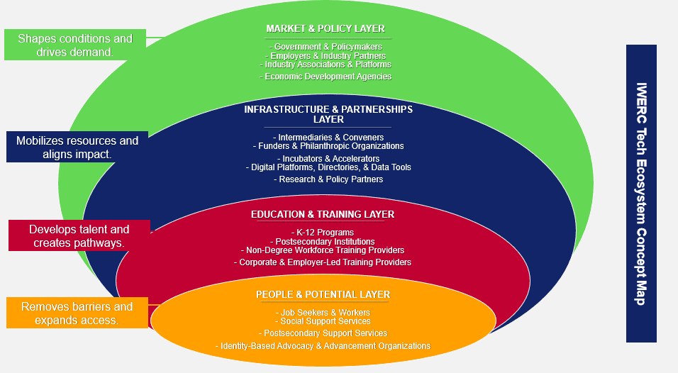 - Whether they are jobseekers, employees, or employers, people are at the heart of the ecosystem. In IWERC’s ecosystem map, which is not a geographical map but a conceptual one, “People and Potential” forms the first of four layers. Above that are three more layers: Education and Training, Infrastructure and Partnerships, and Market and Policy.